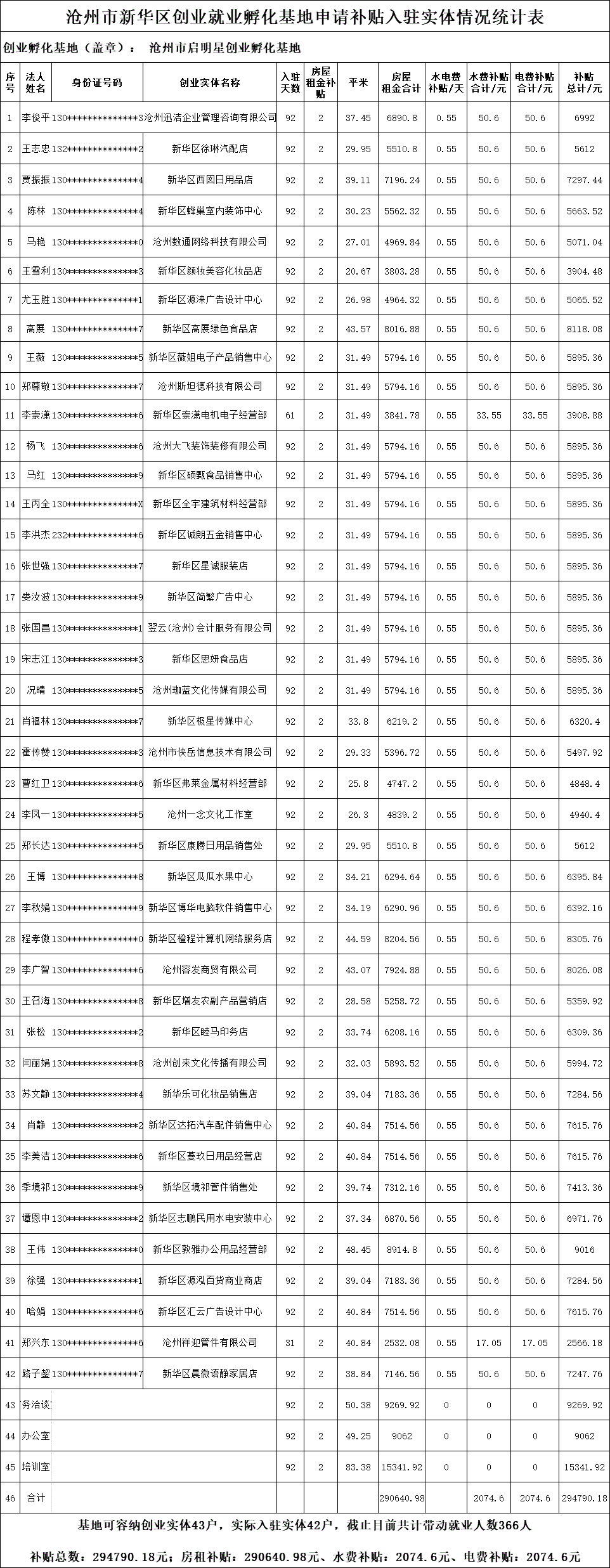 滄州市新華區(qū)創(chuàng)業(yè)就業(yè)孵化基地申請補貼入駐實體情況統(tǒng)計表