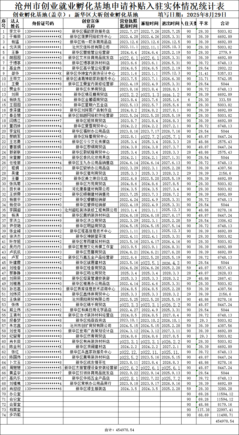 滄州市創(chuàng)業(yè)就業(yè)孵化基地申請(qǐng)補(bǔ)貼入駐實(shí)體情況統(tǒng)計(jì)表