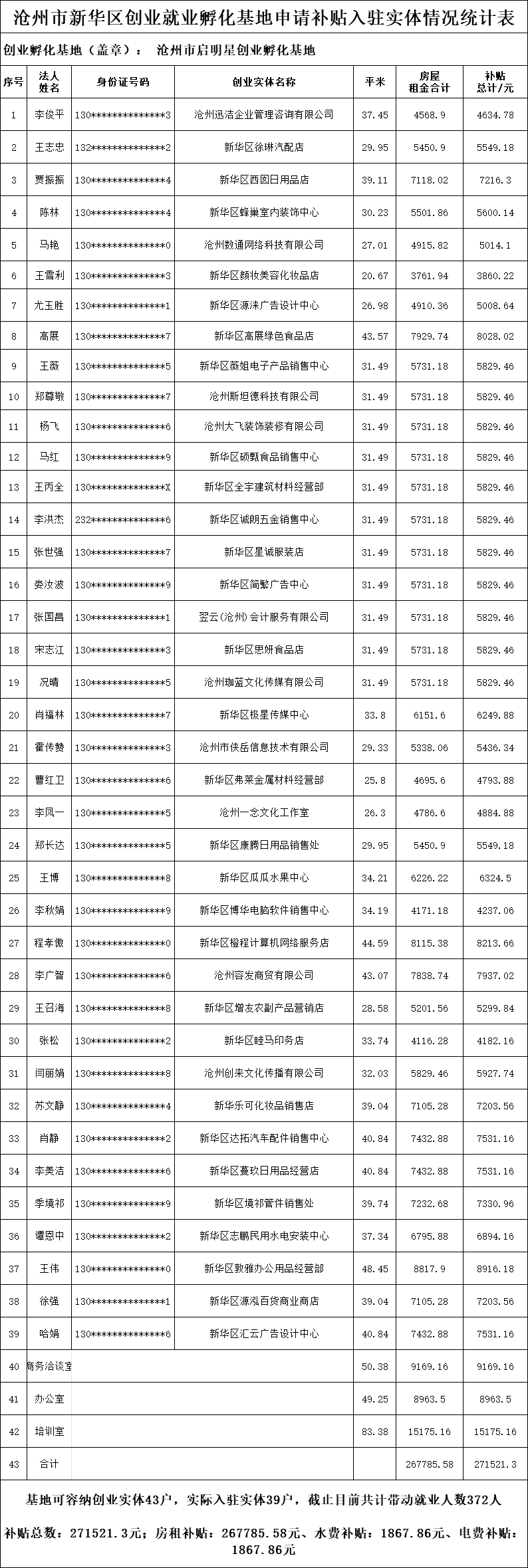 根據(jù)滄州市財政局、滄州市人力資源和社會保障局關(guān)于轉(zhuǎn)發(fā)《關(guān)于印發(fā)<滄州市就業(yè)創(chuàng)業(yè)資金管理辦法>》的通知(滄市財社【2018】379號)要求,現(xiàn)對入駐滄州新華區(qū)啟明星創(chuàng)業(yè)孵化基地創(chuàng)業(yè)項目名冊進(jìn)行公示,公示期為3天,公示時間為2025年8月29日至2025年9月 2日。