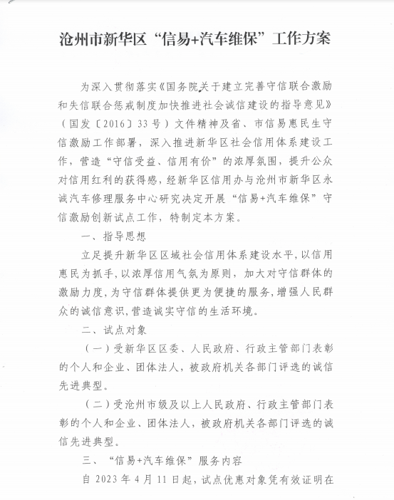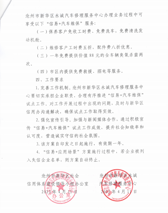 自2023年4月11日起,試點(diǎn)優(yōu)惠對(duì)象憑有效證明在滄州市新華區(qū)永誠(chéng)汽車修理服務(wù)中心維保過(guò)程中可享受以下“信易+汽車維?!狈?wù):