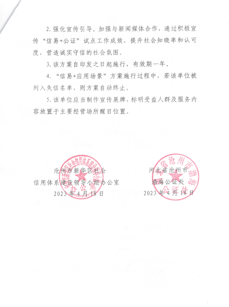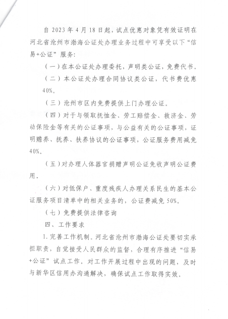 自2023年4月18日起,試點優(yōu)惠對象憑有效證明在河北省滄州市渤海公證處辦理業(yè)務過程中可享受以下“信易+公證”服務: