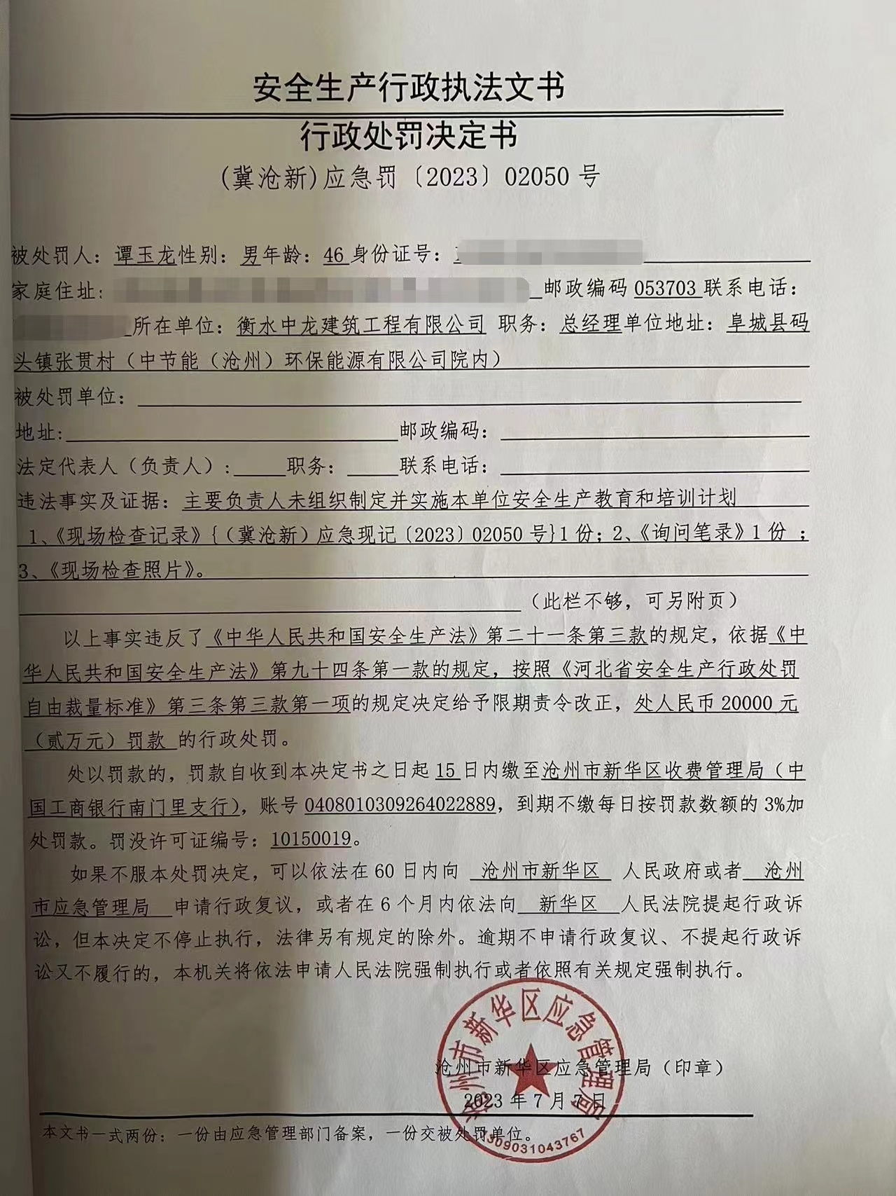 衡水中龍建筑工程有限公司主要負責人未組織制定并實施本單位安全生產(chǎn)教育和培訓計劃(冀滄新)應急罰〔2023〕02050號
