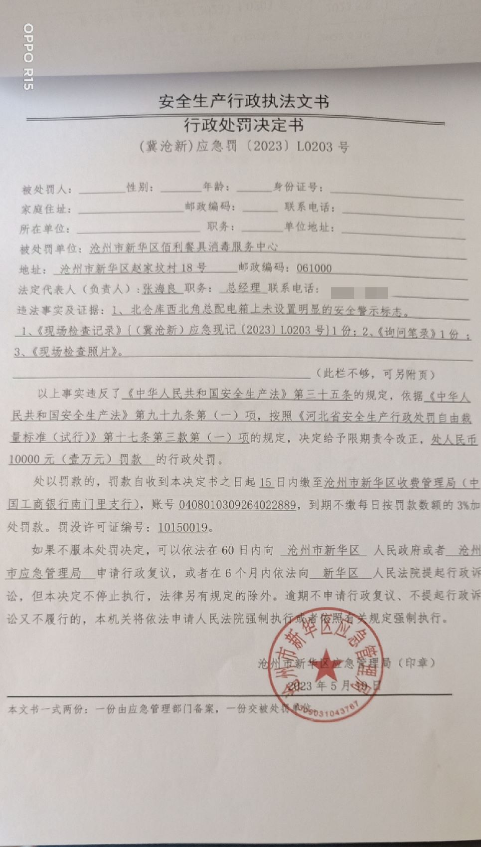 滄州市新華區(qū)佰利餐具消毒服務(wù)中心北倉庫西北角總配電箱上未設(shè)置明顯的安全警示標志。 & #40;冀滄新& #41;應(yīng)急罰〔2023〕L0203號