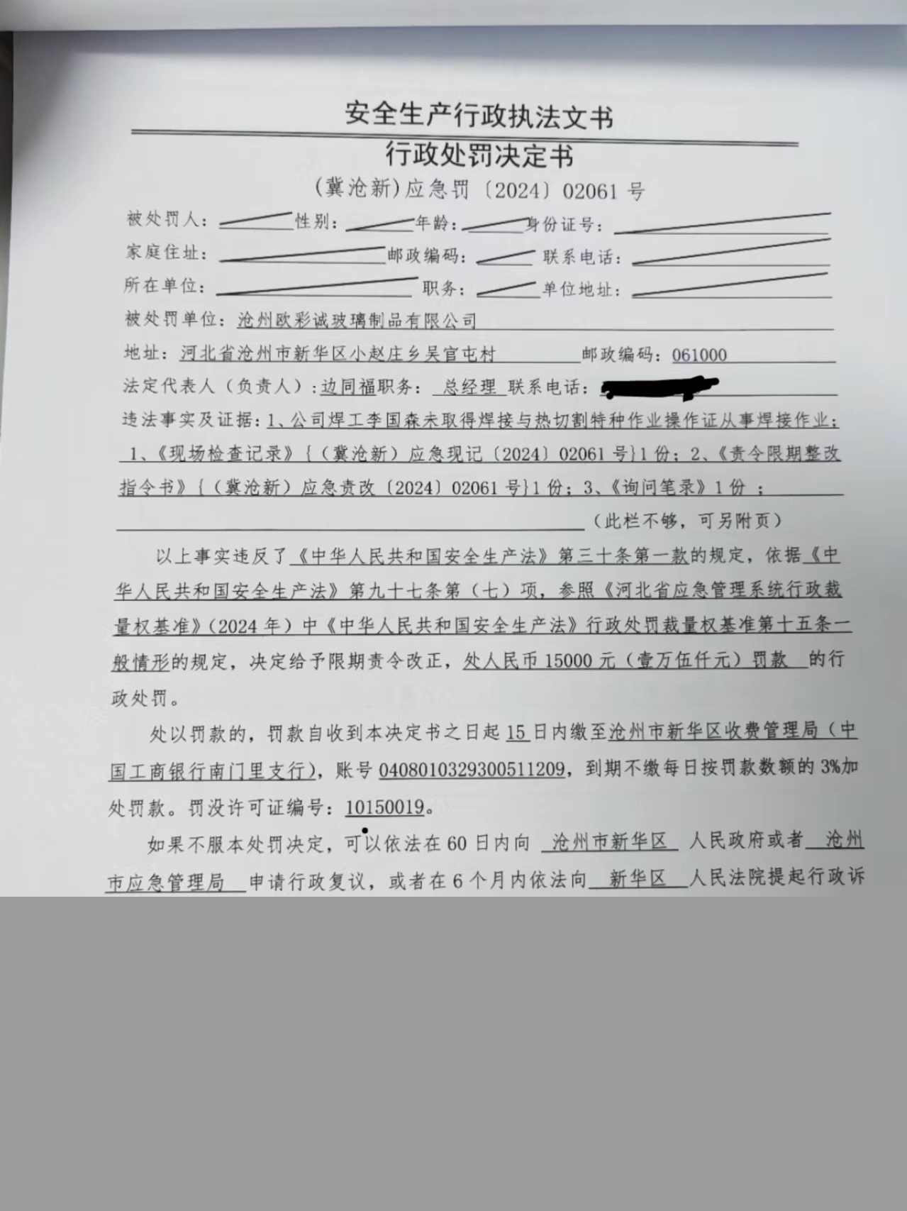 滄州歐彩誠玻璃制品有限公司焊工李國森未取得焊接與熱切割特種作業(yè)操作證從事焊接作業(yè)案(冀滄新)應(yīng)急罰【2024】02061號