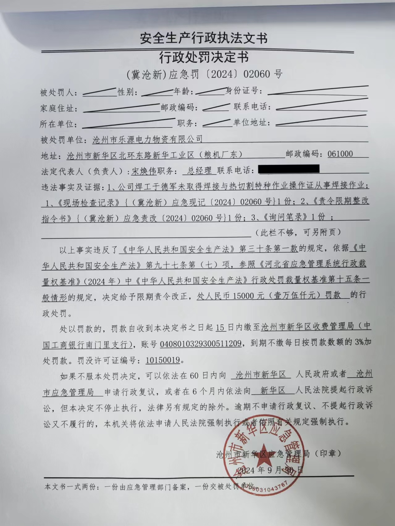 滄州市樂源電力資源有限公司焊工于德軍未取得焊接與熱切割特種作業(yè)操作證從事焊接作業(yè)案(冀滄新)應(yīng)急罰【2024】02060號