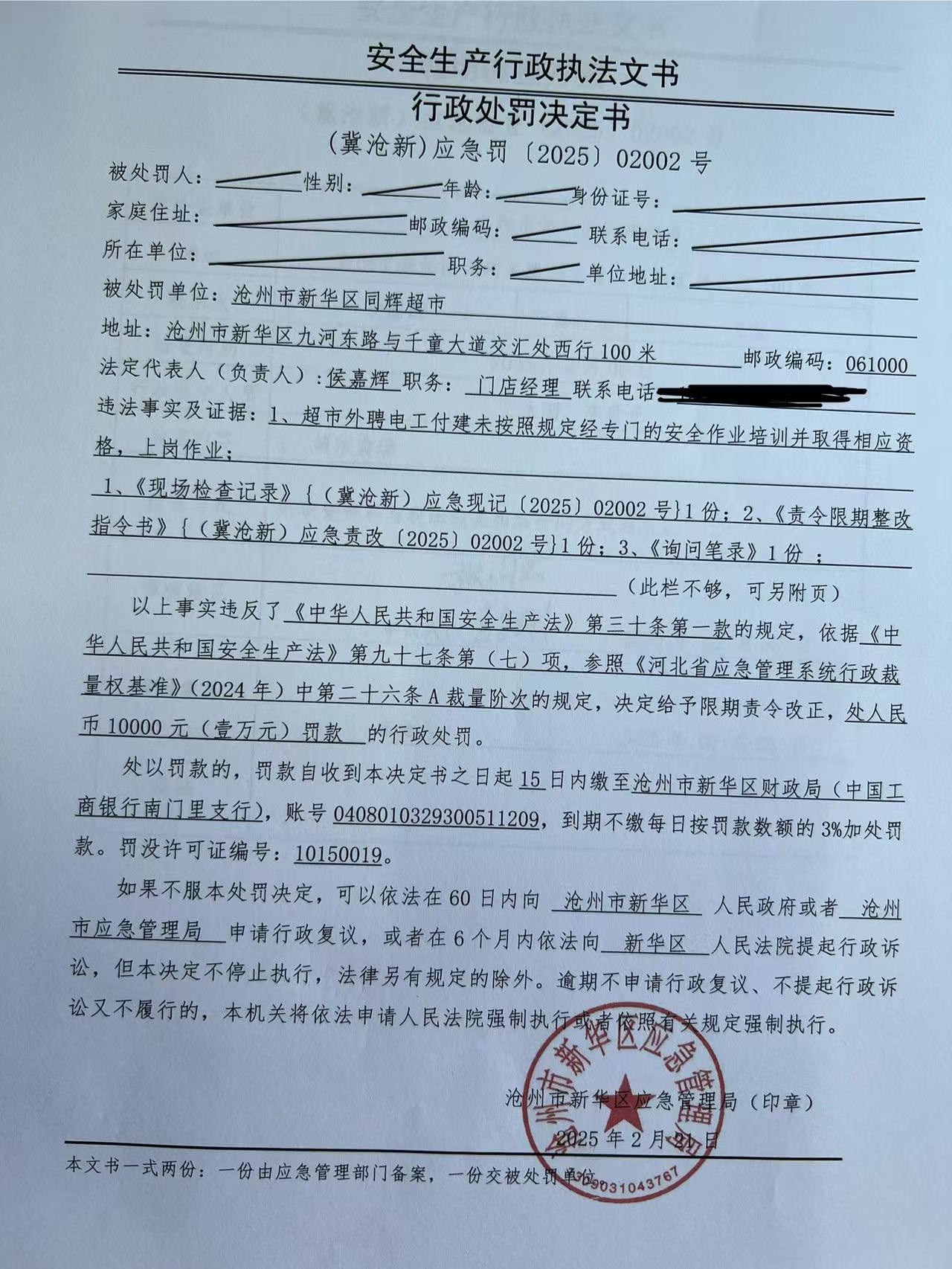 滄州市新華區(qū)同輝超市外聘電工付建未按照規(guī)定經(jīng)專門的安全作業(yè)培訓(xùn)并取得相應(yīng)資格,上崗作業(yè)案(冀滄新)應(yīng)急罰〔2025〕02002號(hào)