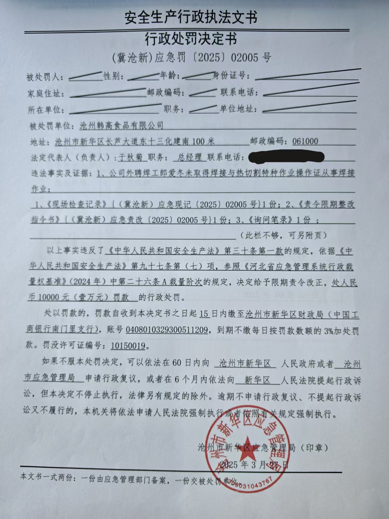 滄州韓高食品有限公司外聘焊工郎愛冬未取得焊接與熱切割特種作業(yè)操作證從事焊接作業(yè)案