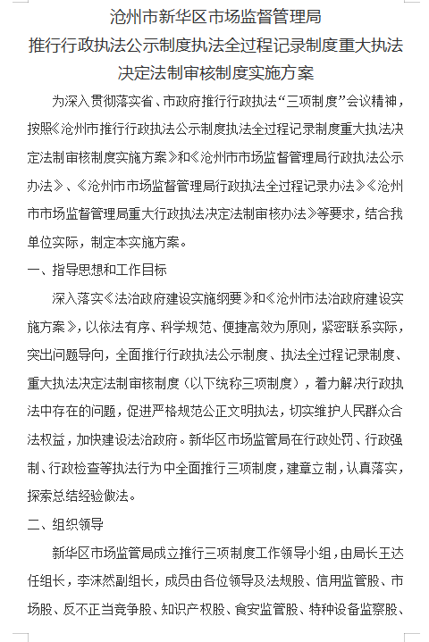 新華區(qū)市場監(jiān)督管理局全面推行行政執(zhí)法三項制度實施方案