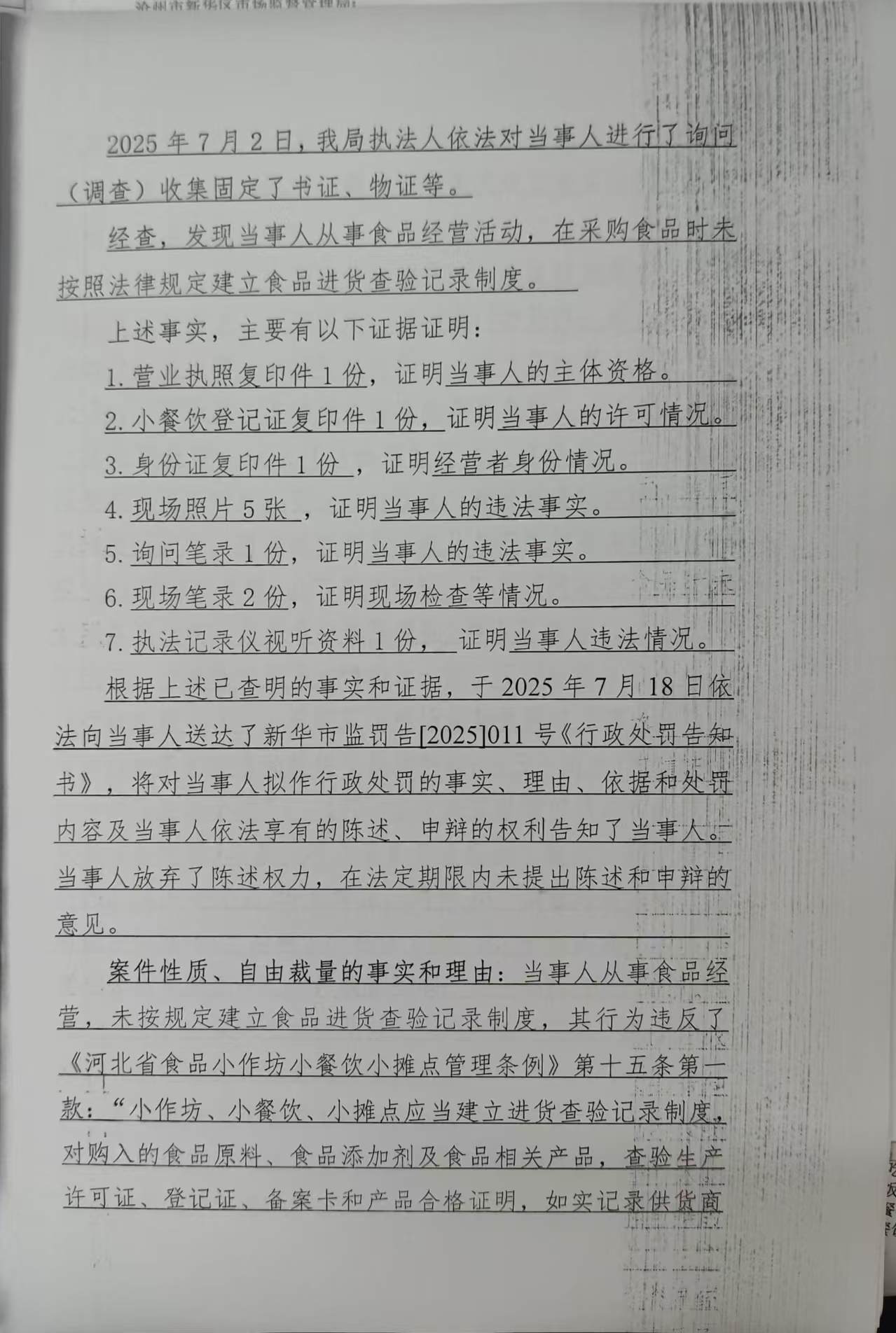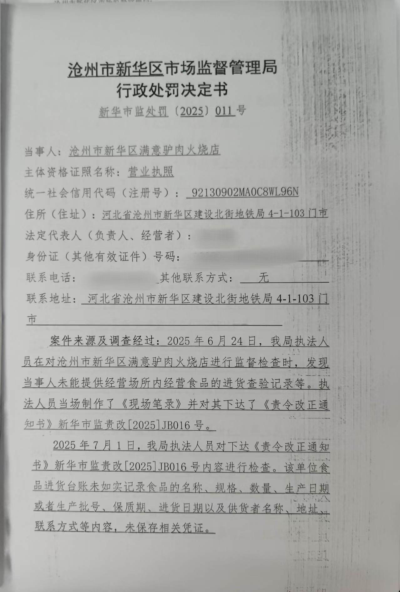 滄州市新華區(qū)滿意驢肉火燒店未按規(guī)定建立食品進(jìn)貨查驗(yàn)記錄制度案