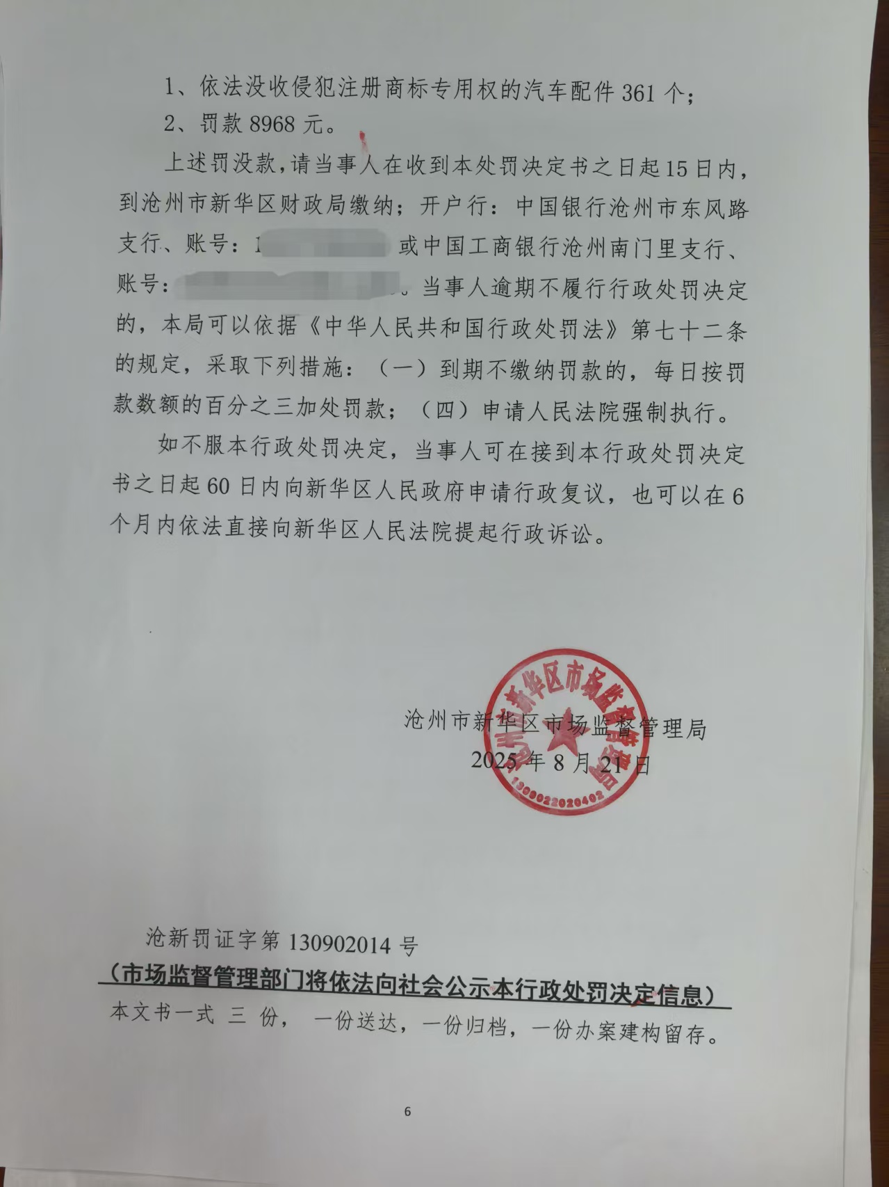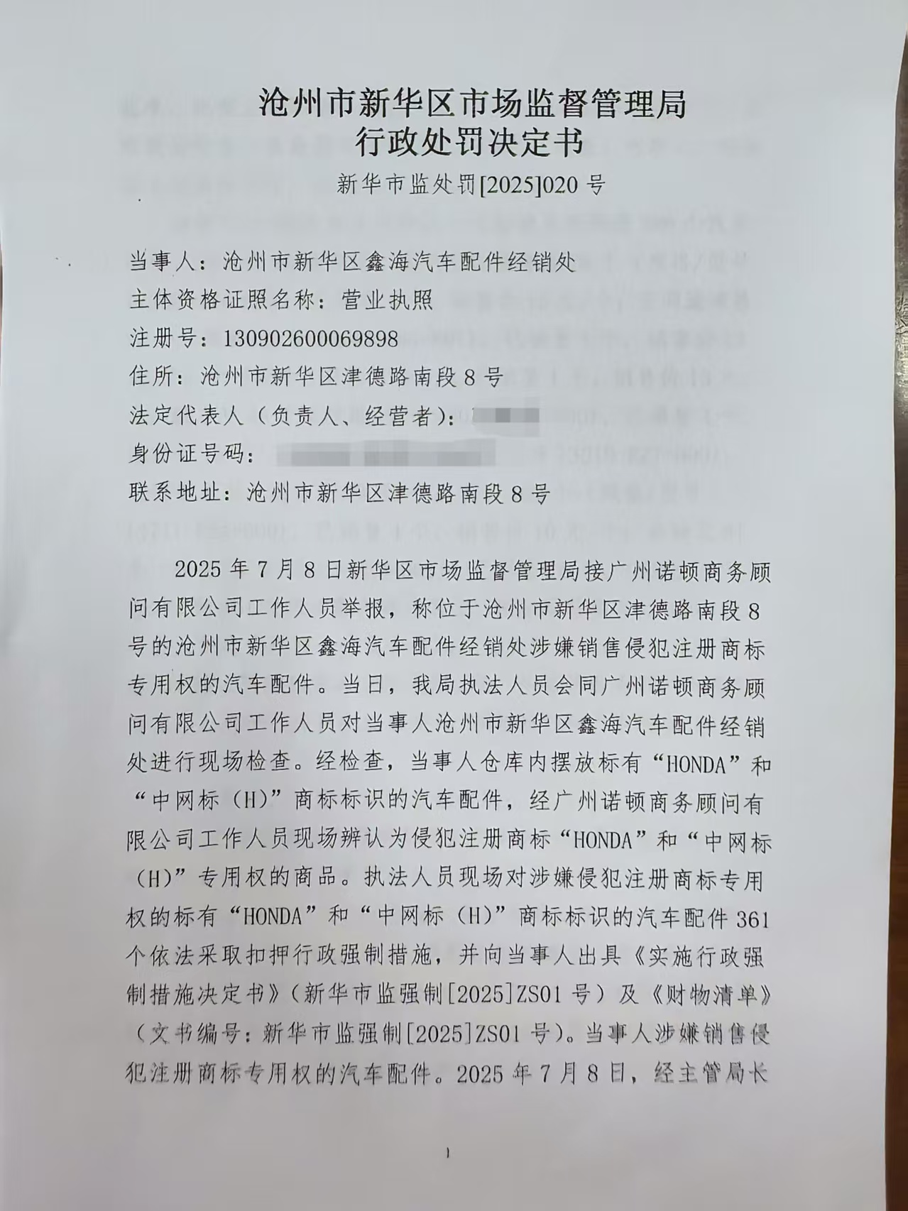 滄州市新華區(qū)鑫海汽車配件經(jīng)銷處涉嫌銷售侵犯注冊商標專用權(quán)的汽車配件案