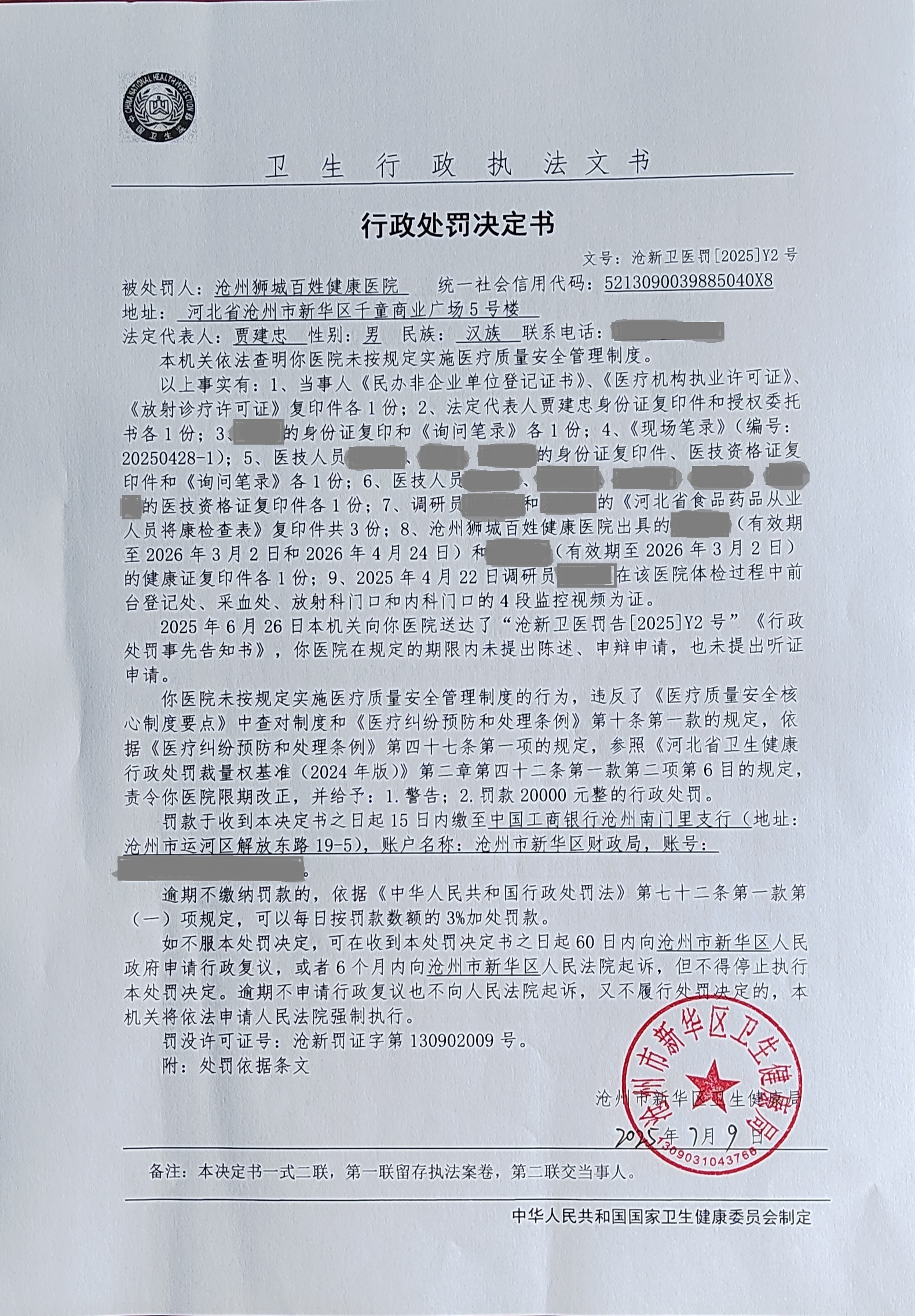 滄州獅城百姓健康醫(yī)院行政處罰公示