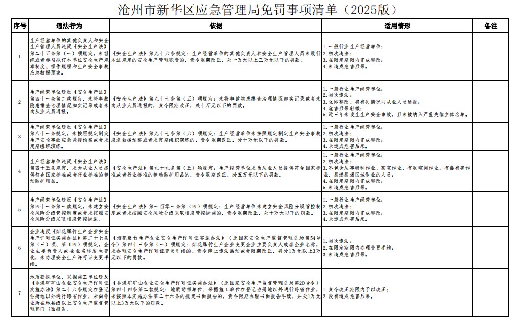 滄州市新華區(qū)應(yīng)急管理局免罰事項(xiàng)清單(2025版)