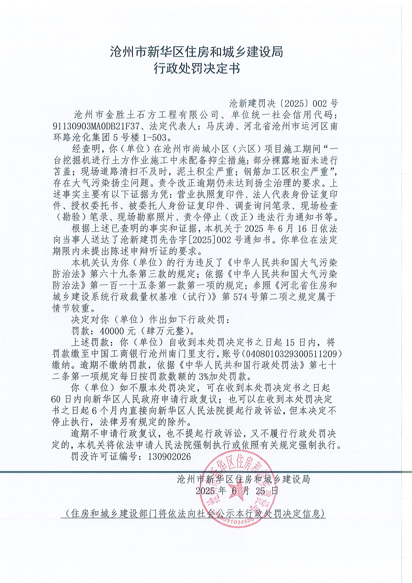 滄州市金勝土石方工程有限公司違反大氣污染揚(yáng)塵作業(yè)案-滄新建罰決[2025]002號