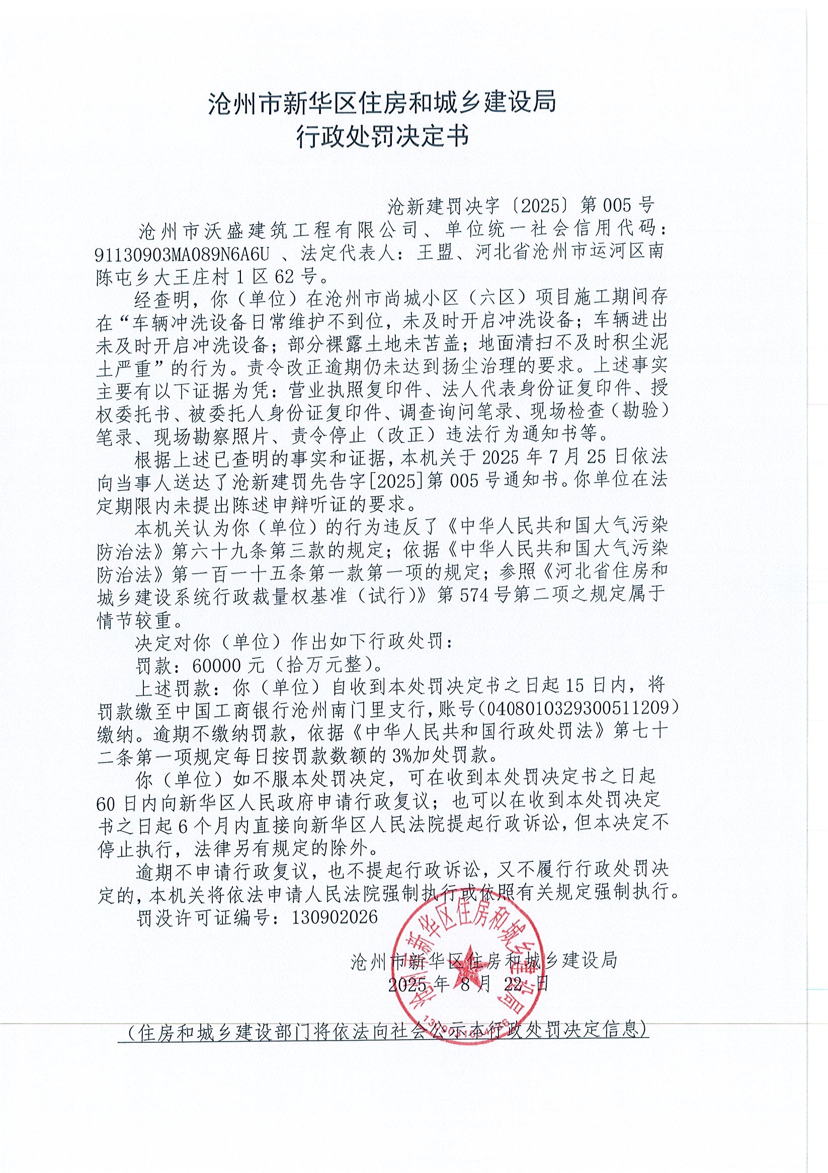 滄州市沃盛建筑工程有限公司違反大氣污染揚(yáng)塵作業(yè)案-滄新建罰決字[2025]第005號