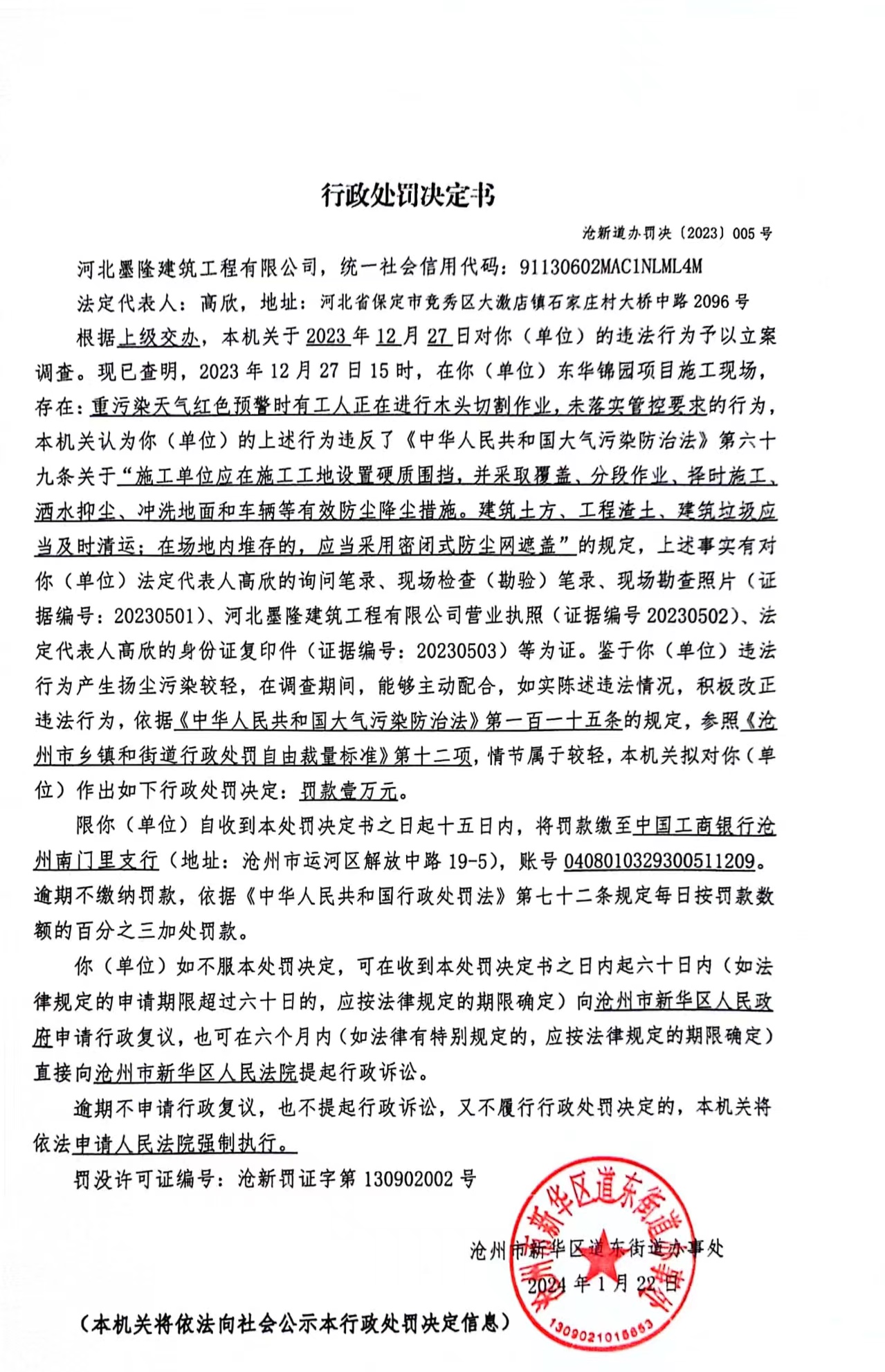 滄新道辦罰決[2023]005號(hào)