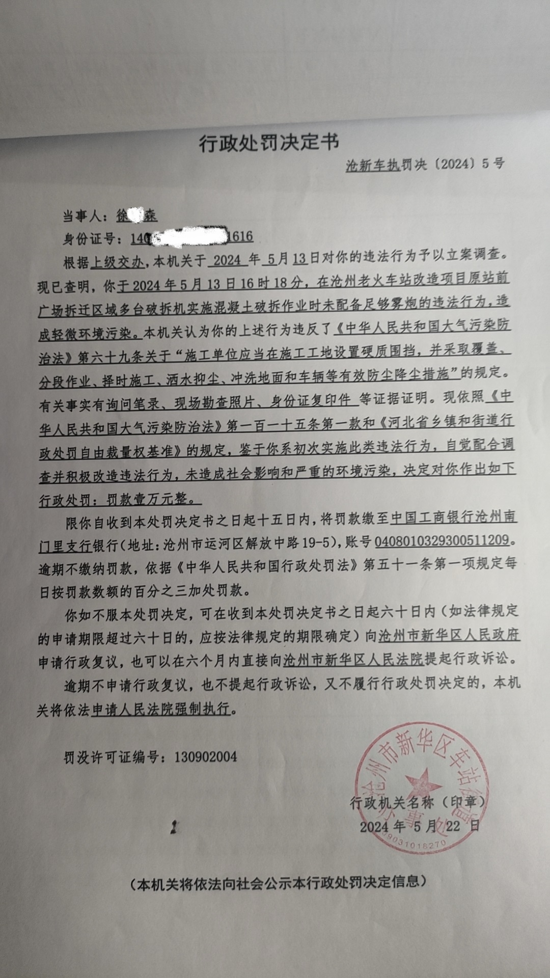 滄新車執(zhí)罰決〔2024〕5號