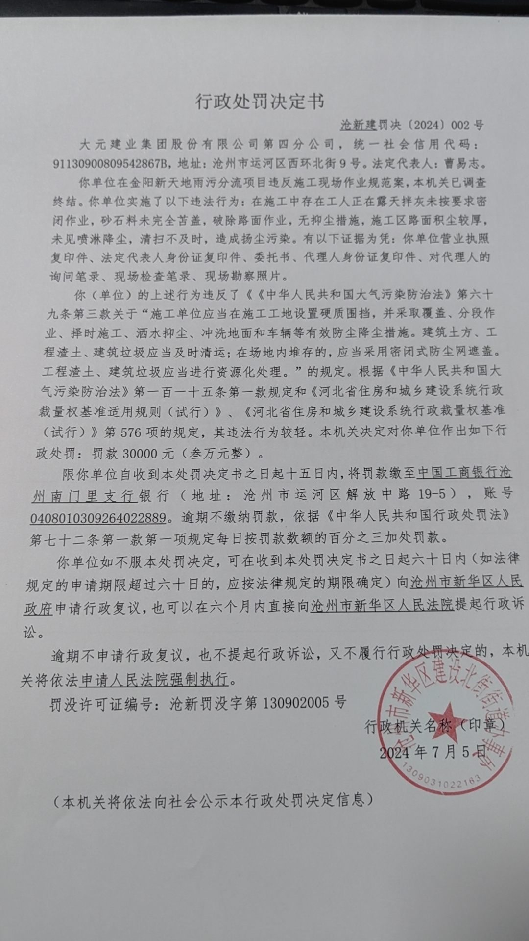 大元建業(yè)集團股份有限公司第四分公司金陽新天地雨污分流項目違反施工現(xiàn)場作業(yè)規(guī)范案 滄新建罰決【2024】002號