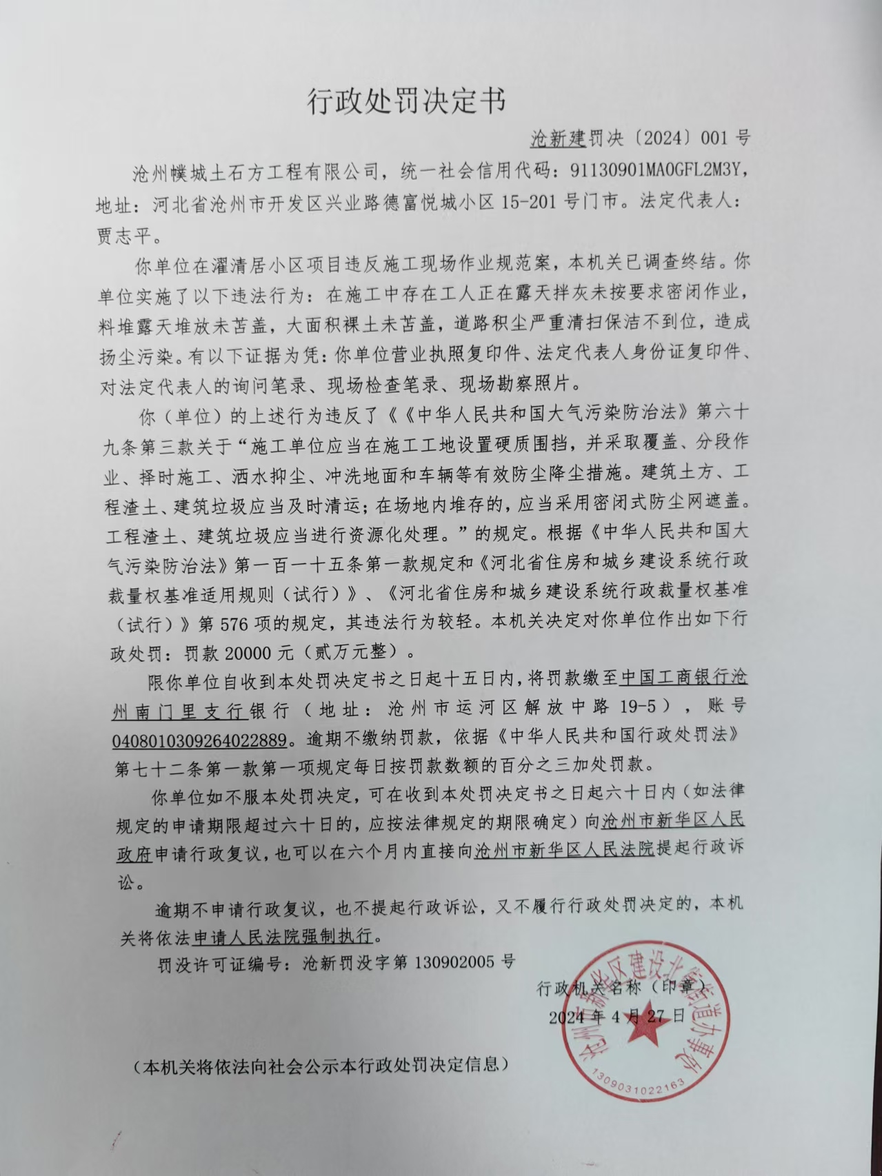 滄州幞城土石方工程有限公司濯清居小區(qū)項目違反施工現(xiàn)場作業(yè)規(guī)范案【2024】001號