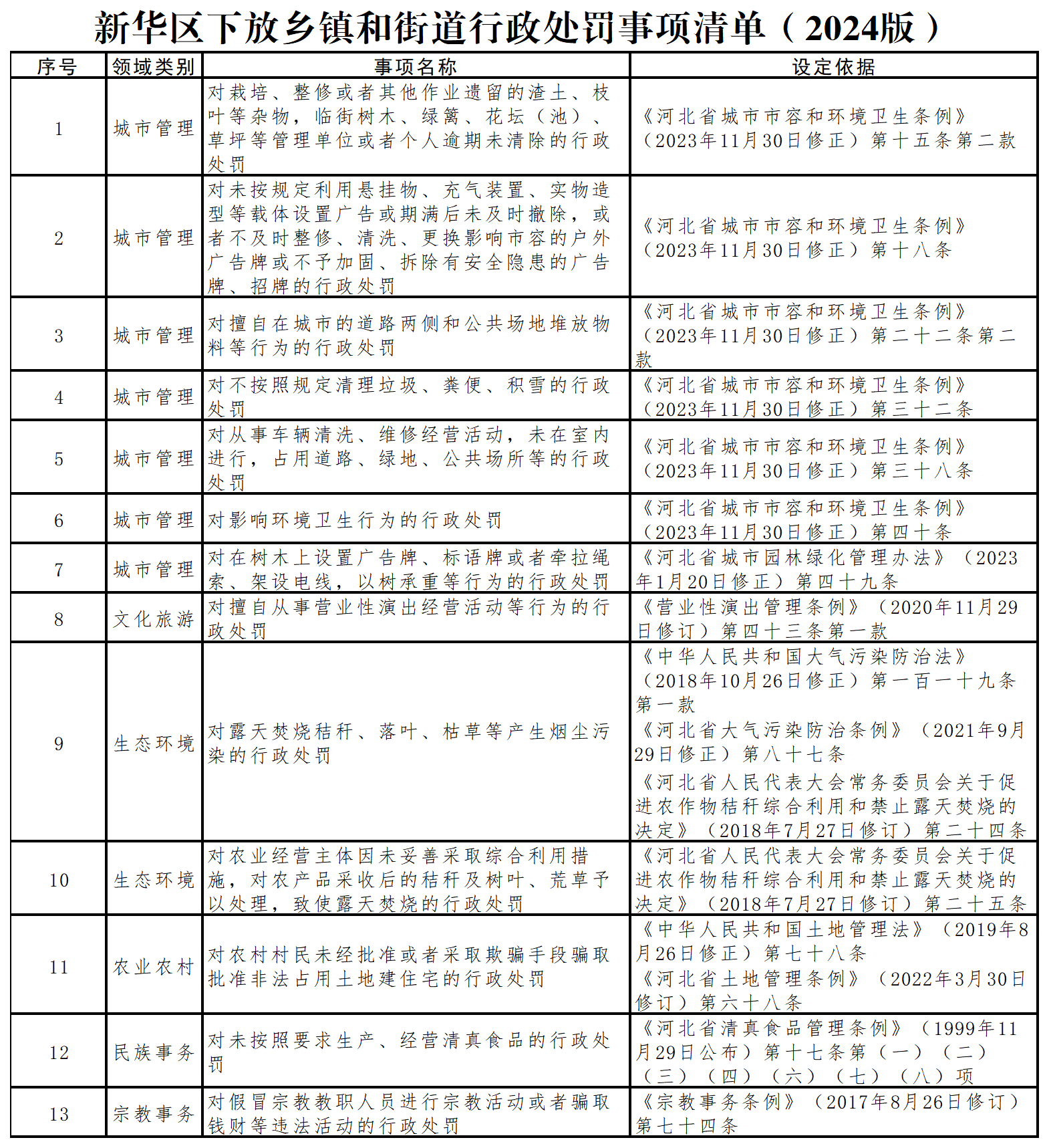 新華區(qū)下放鄉(xiāng)鎮(zhèn)和街道行政處罰事項清單(2024版)