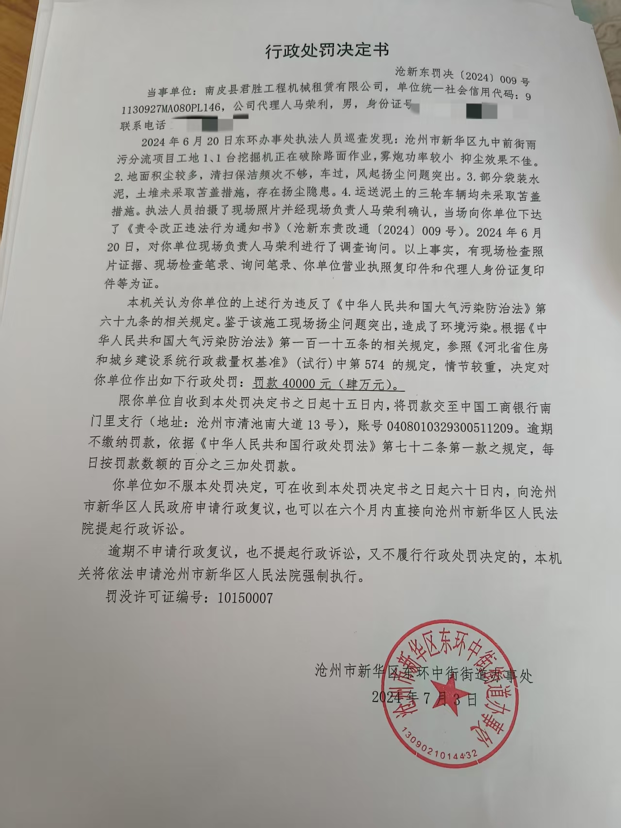 滄新東罰決【2024】009號(hào)
