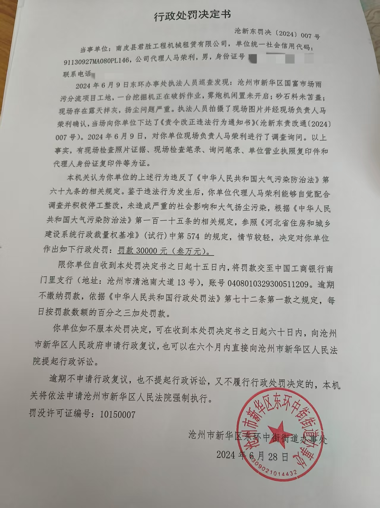 滄新東罰決【2024】007號