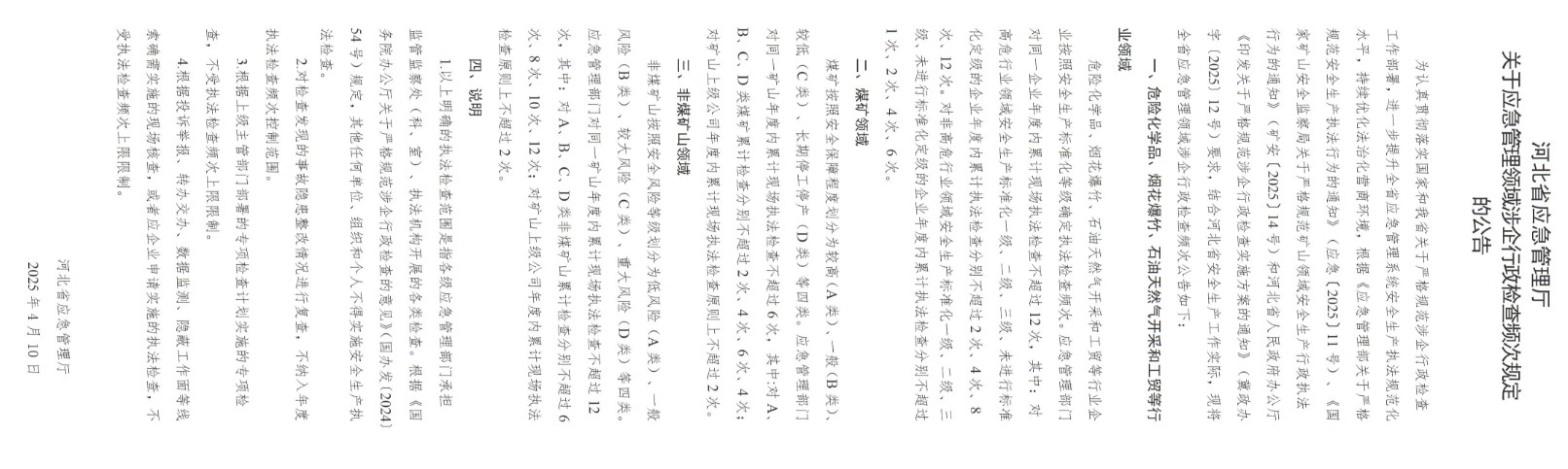 河北省應(yīng)急管理廳關(guān)于應(yīng)急管理領(lǐng)域涉企行政檢查頻次規(guī)定的公告