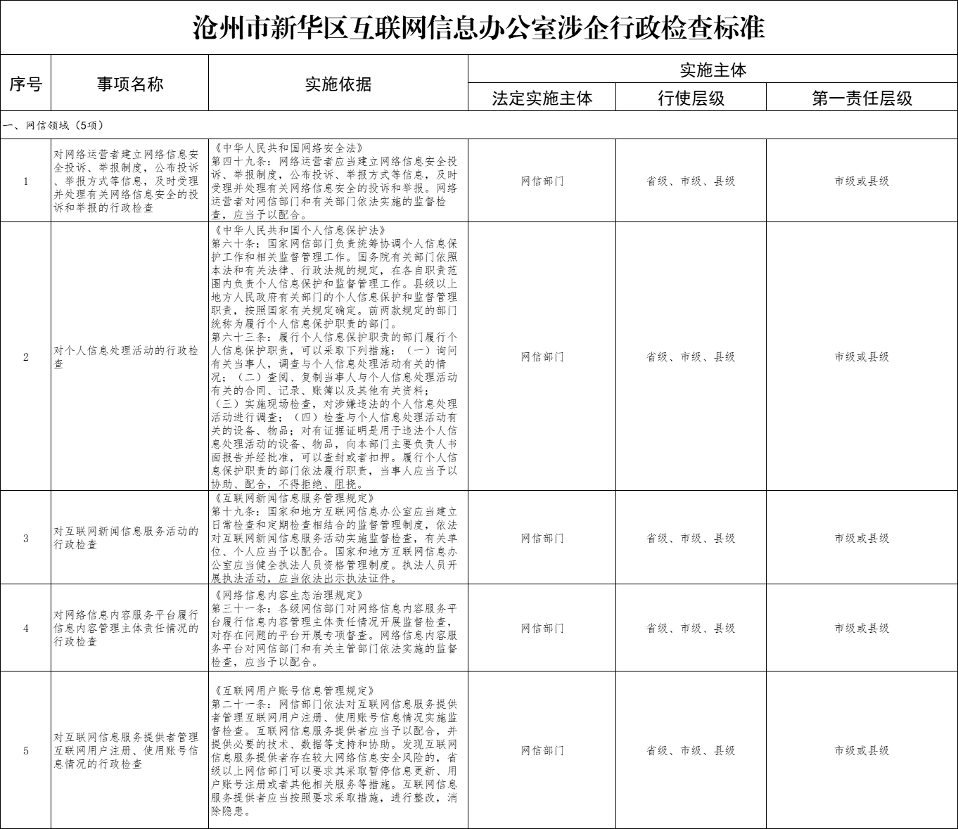 滄州市新華區(qū)互聯(lián)網(wǎng)信息辦公室涉企行政檢查標(biāo)準(zhǔn)